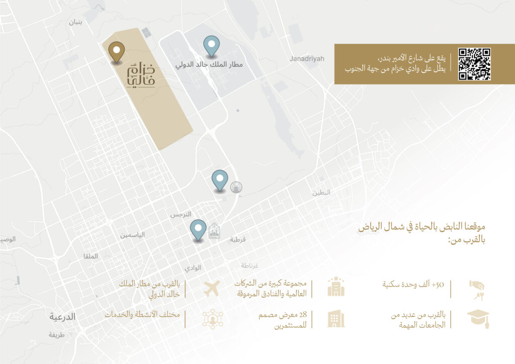 في قلب شمال الرياض المتنامي، تتألق خُزام كوجهة مميزة واستثنائية بمساحة إجمالية تبلغ ٣٠ مليون متر مربع يتوسطها أحد أهم الحدائق المملكة، على مساحة ٤,٥ مليون متر مربع